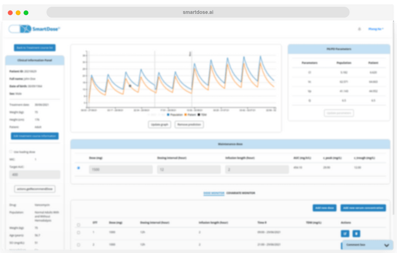 SmartDoseAI là nền tảng hỗ trợ các cơ sở y tế trong việc cá thể hóa liều dùng và theo dõi nồng độ của các thuốc có khoảng điều trị hẹp. Sử dụng công nghệ AI, nền tảng SmartDoseAI giúp các nhà lâm sàng: